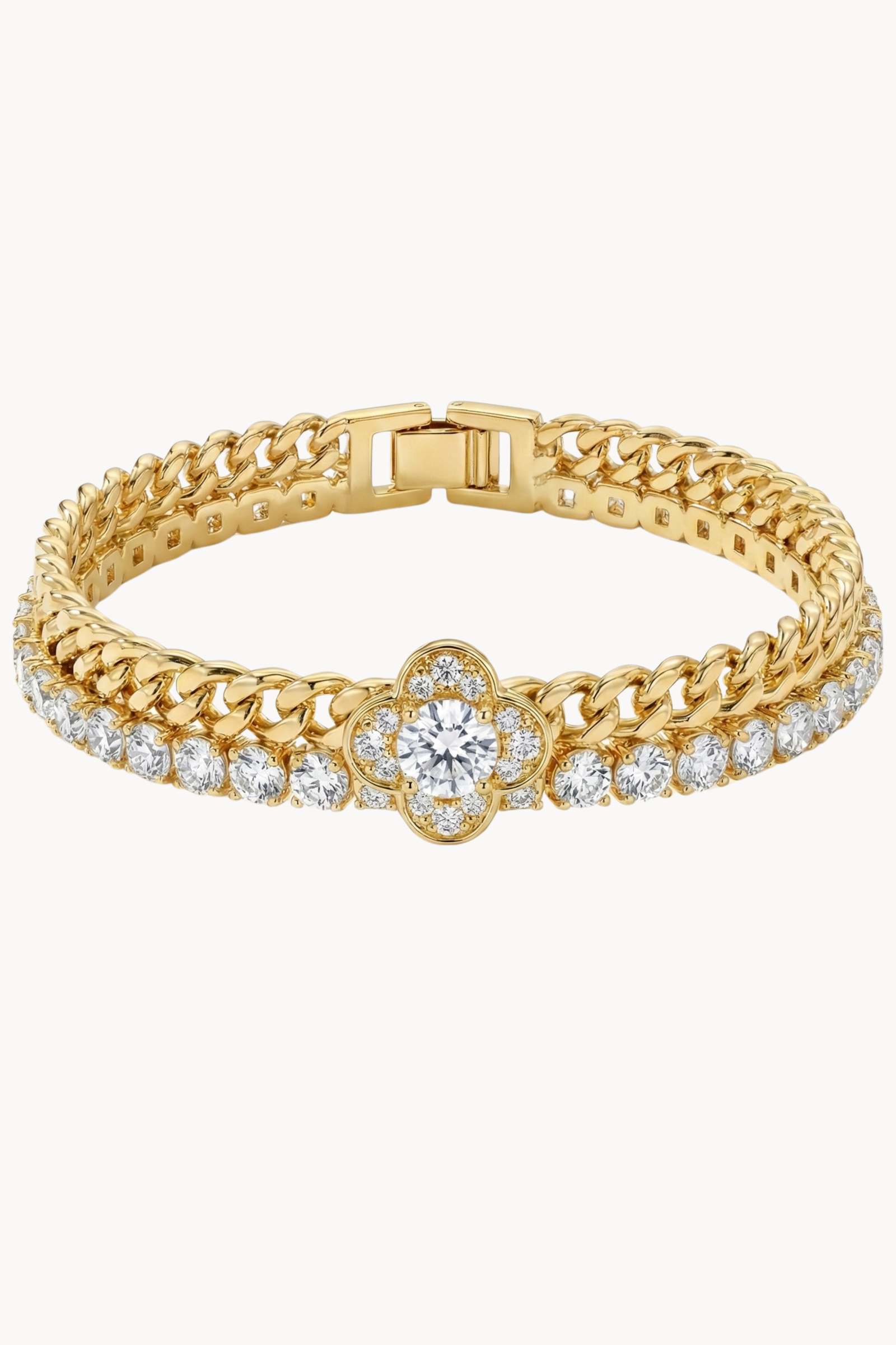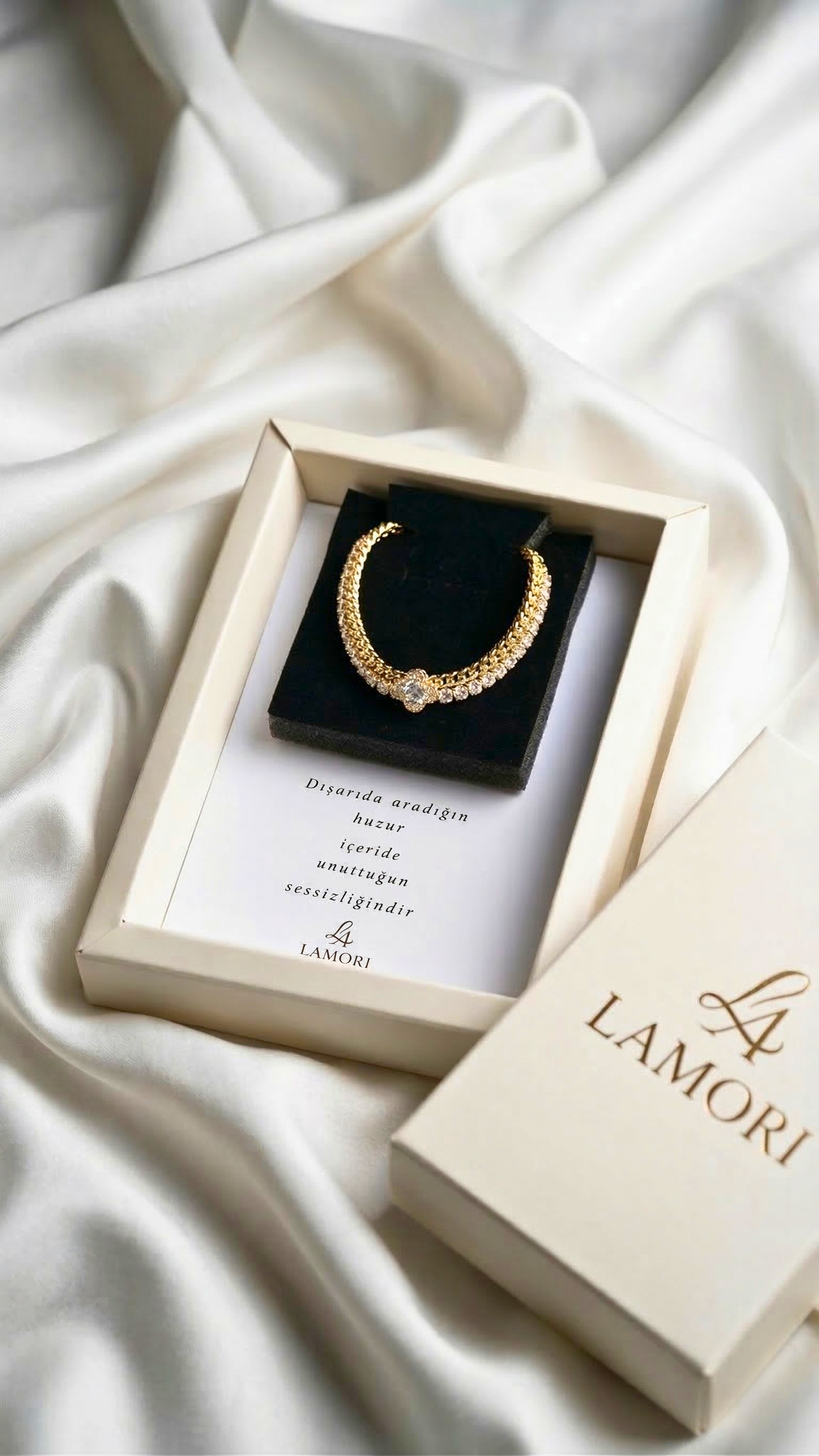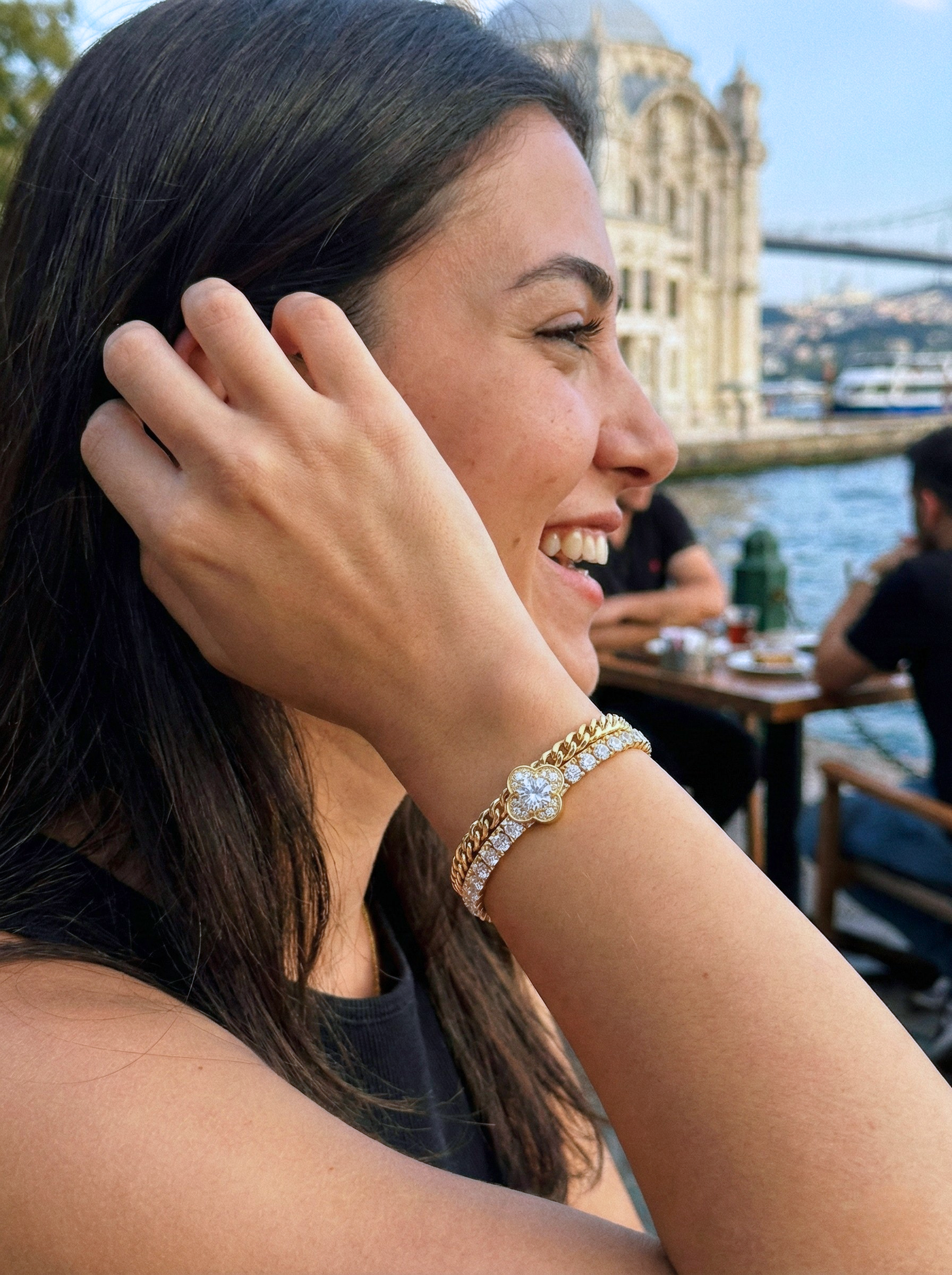 Su yolunun kesintisiz ışıltısı ve altın kaplama zincirin dolgun dokusu bir arada. Merkezdeki taşın berraklığıyla tamamlanan, bilekteki o güçlü his.