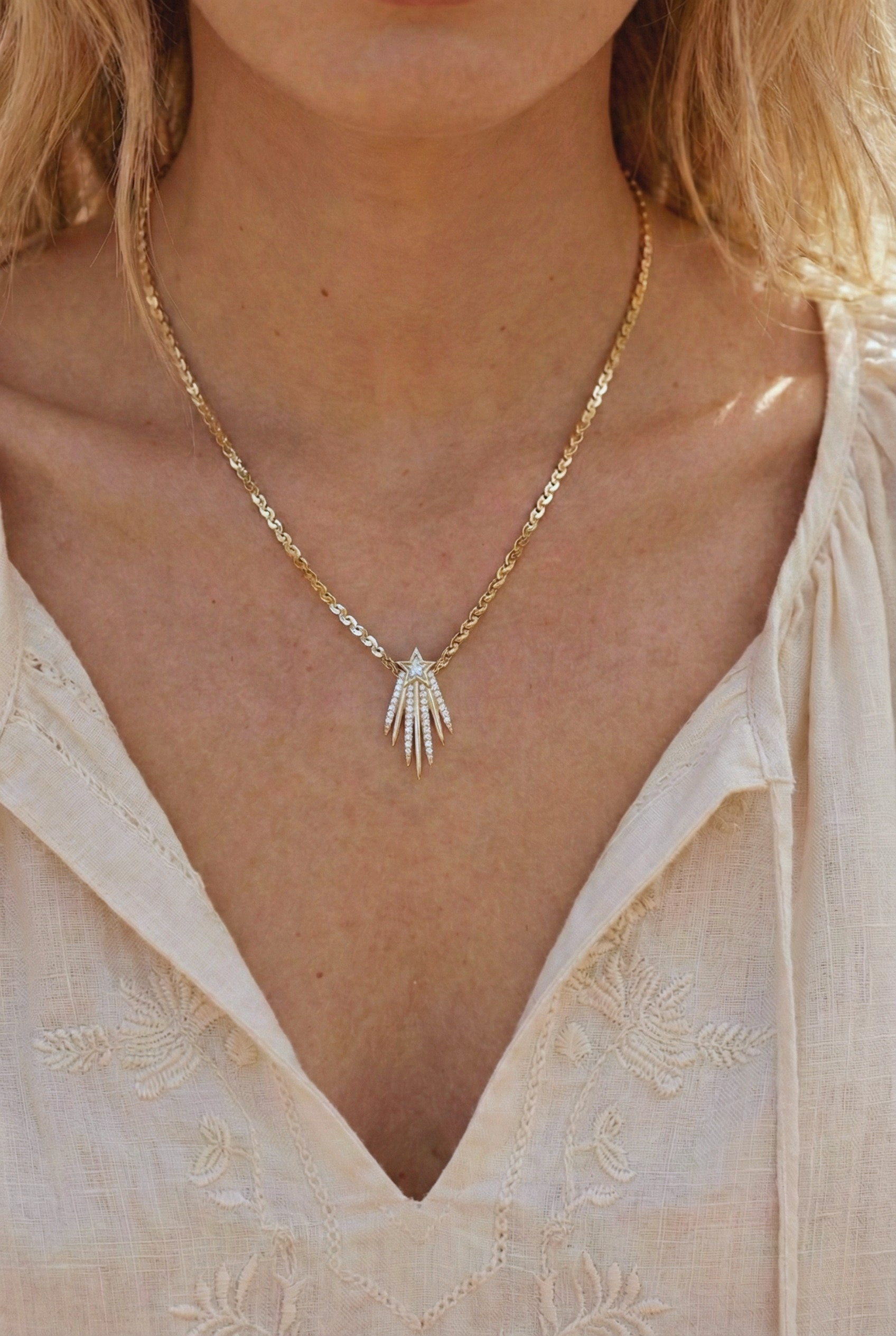 Altın huzmelerin dikey akışı ve yıldız formunun keskin ışıltısı.